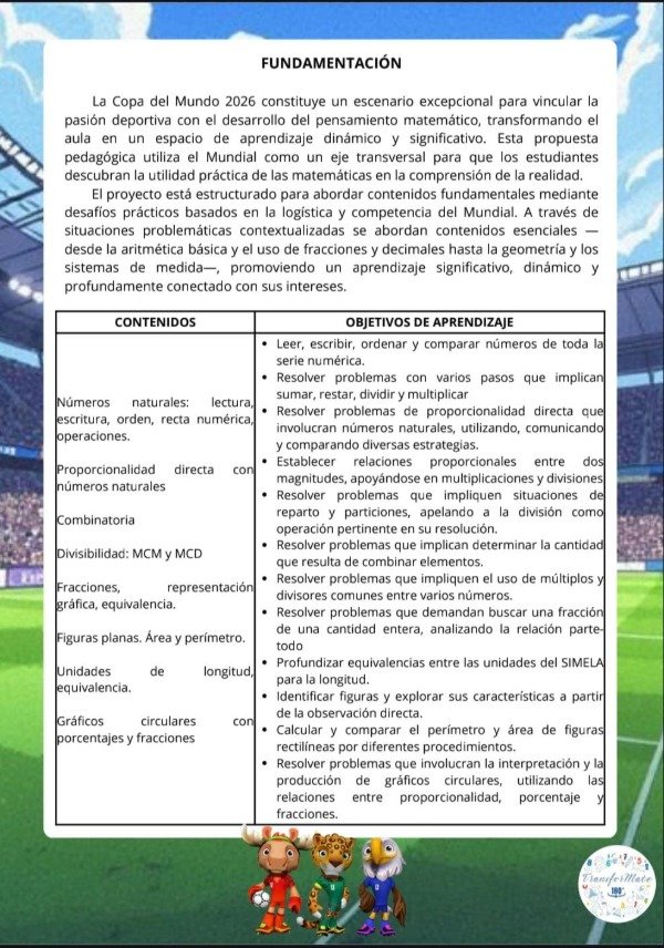 El proyecto está estructurado para abordar contenidos fundamentales mediante desafíos prácticos basados en la logística y competencia del Mundial. A través de situaciones problemáticas contextualizadas se abordan contenidos esenciales —desde la aritmética básica y el uso de fracciones y decimales hasta la geometría y los sistemas de medida—, promoviendo un aprendizaje significativo, dinámico y profundamente conectado con sus intereses.