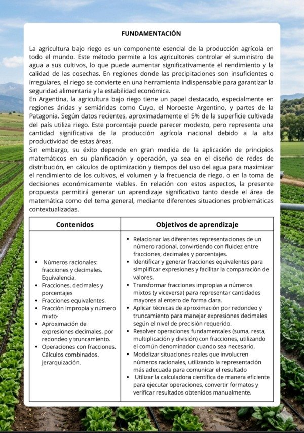 Sin embargo, su éxito depende en gran medida de la aplicación de principios matemáticos en su planificación y operación, ya sea en el diseño de redes de distribución, en cálculos de optimización y tiempos del uso del agua para maximizar el rendimiento de los cultivos, el volumen y la frecuencia de riego, o en la toma de decisiones económicamente viables. En relación con estos aspectos, la presente propuesta permitirá generar un aprendizaje significativo tanto desde el área de matemática como del tema general, mediante diferentes situaciones problemáticas contextualizadas.